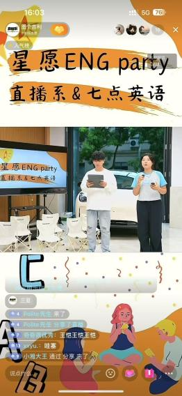 为推动英语学习与实践场景深度融合,七点英语联合学校直播系“图个吉利”直播间,共同打造“星愿ENG party”英文直播活动。50名学生围绕吉利星愿汽车主题“真题真做”,历经两周筹备后完成2小时全英文直播,从脚本撰写、口语表达到镜头互动全程自主把控。