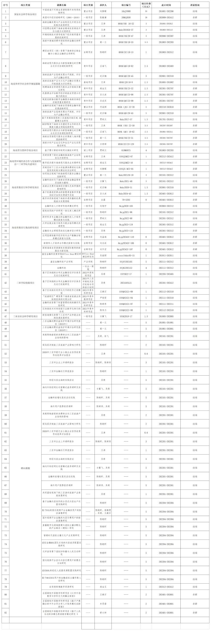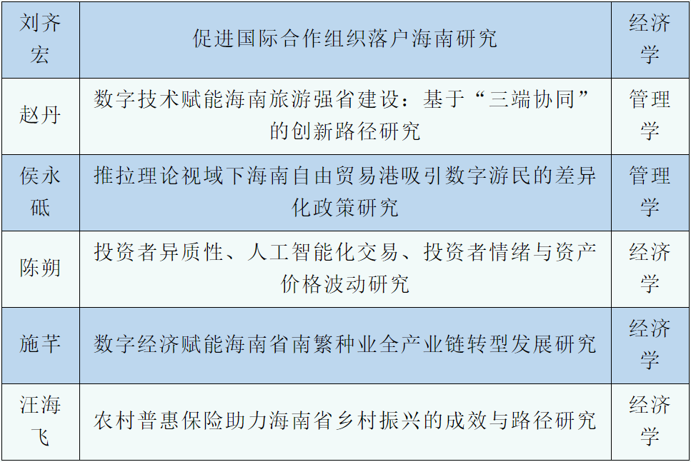 近日,海南省社会科学界联会公布“2025年海南省哲学社会科学规划课题拟立项名单”。盛宝金科学院获批立项数再创新高,共获批立项6项。分别是刘齐宏教授的《促进国际合作组织落户海南研究》获批海南省哲学社会科学重点智库培育课题,赵丹副教授的《数字技术赋能海南旅游强省建设:基于“三端协同”的创新路径研究》获批海南省社科研究基地课题,侯永砥老师的《推拉理论视域下海南自由贸易港吸引数字游民的差异化政策研究 》、陈朔老师的《投资者异质性、人工智能化交易、投资者情绪与资产价格波动研究》、施芊老师的《数字经济赋能海南省南繁种业全产业链转型发展研究》、汪海飞老师的《农村普惠保险助力海南省乡村振兴的成效与路径研究》等四位老师获批海南省哲学社会科学规划课题。