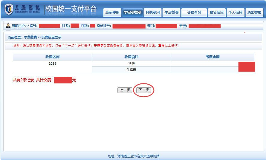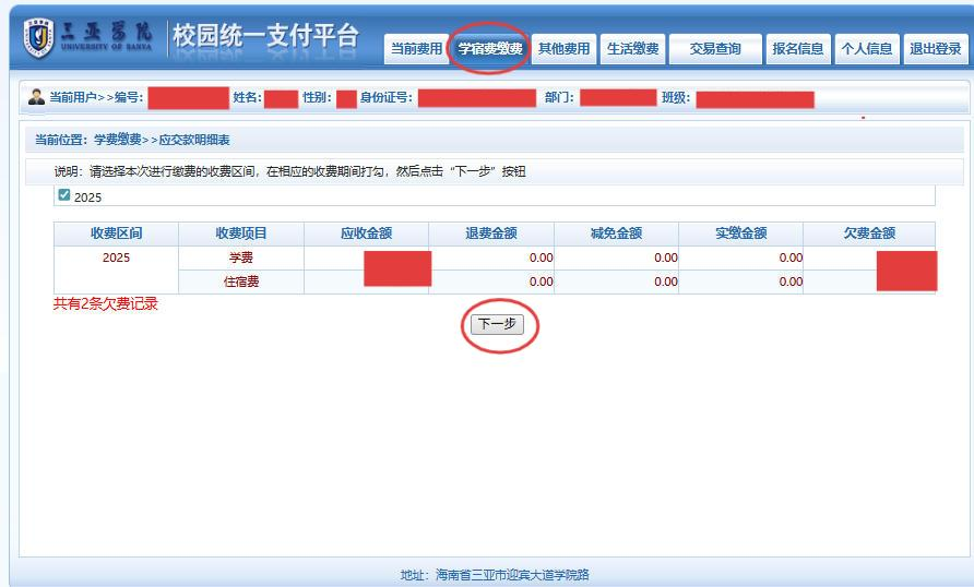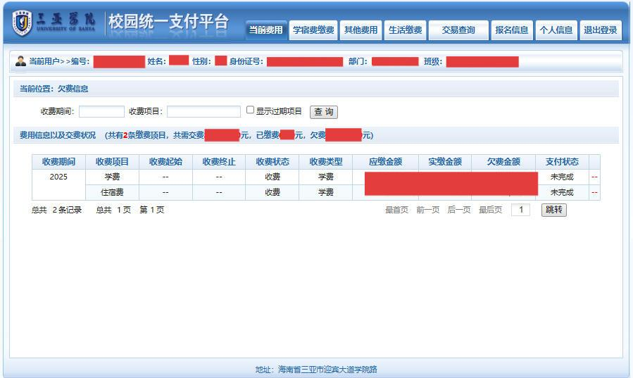 进入以后会显示所有的待缴费记录,然后点“学宿费缴费”,会显示欠学杂费明细,如下