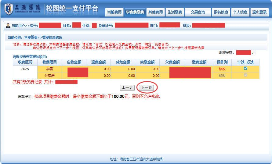 再点下一步,出现缴费信息修改(当年助学贷款审核通过的同学可直接扣除贷款金额后缴纳剩余学费),全选后点击下一步,如下: