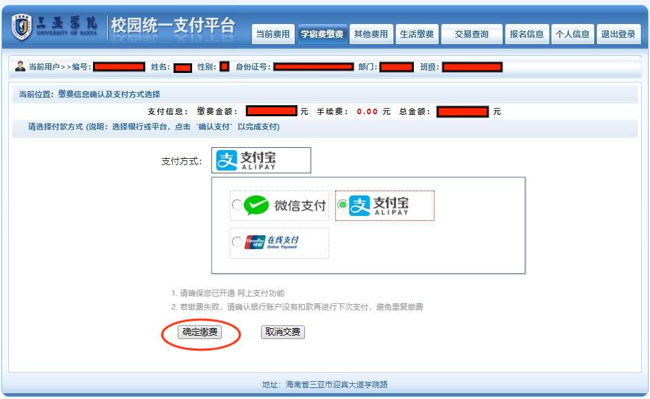 之后会出现选择“微信”、“支付宝”、和“在线支付”缴费(支持所有开通了网银的银联卡付款),确认付款方式之后点击确定缴费,如下: