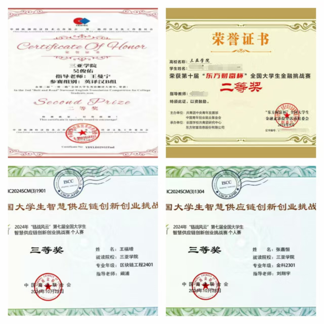 学堂荣获校级优秀社团荣誉称号,20余位成员获得全国word、excel、powerpoint决赛特等奖;10余位成员获得第三届全国AI科技大赛一等奖,成员获得东方财富杯全国大学生金融挑战赛(海南省赛)一等奖、二等奖、三等奖若干。一位成员获得全国大学生数学建模省赛三等奖,一位成员获得2024年“海豚杯”翻译大赛暨国际翻译人才选拔赛全国二等奖,3位成员获得第七届全国大学生智慧供应链创新创业挑战赛个人赛三等奖。第十一届东方财富金融挑战赛共计30人获得国奖,其中一等奖6人;省赛获奖85人,其中一等奖15人。